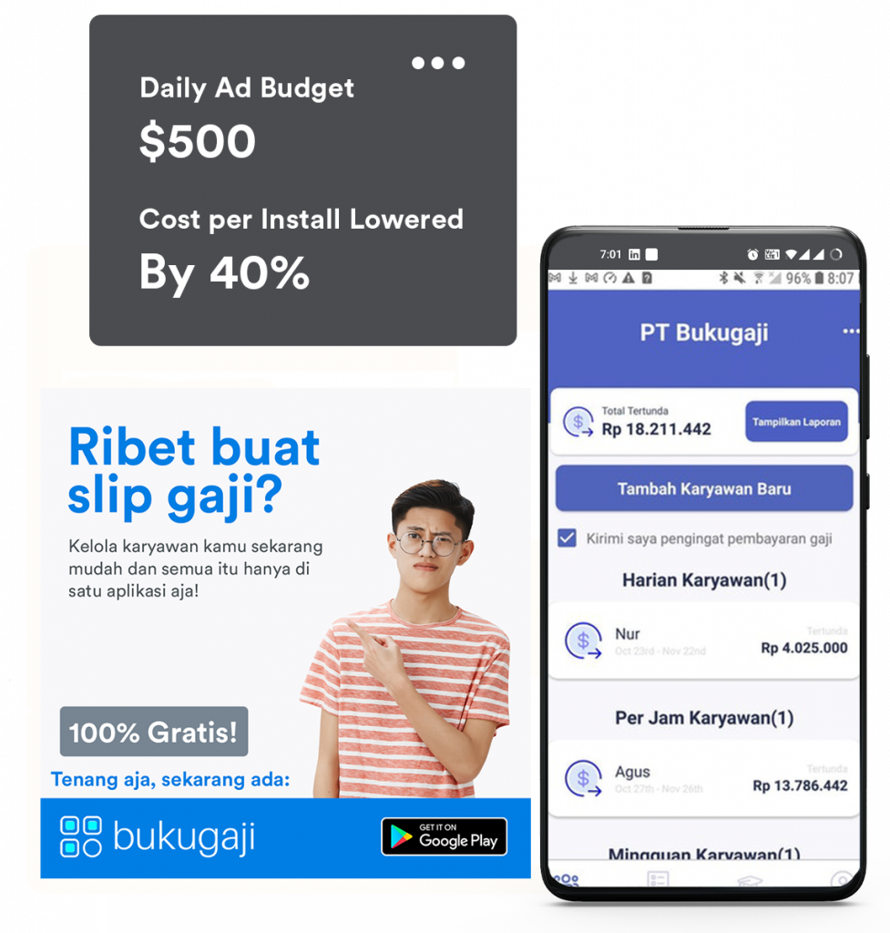 The client approached WireMonster to help market their staff management mobile application, Bukugaji, in Indonesia. They wanted to target a nationwide audience focusing on particular groups and gather app installs through social platforms like Facebook and Google AdWords. Additionally, their goal was to decrease the CPI and boost downloads of the app.