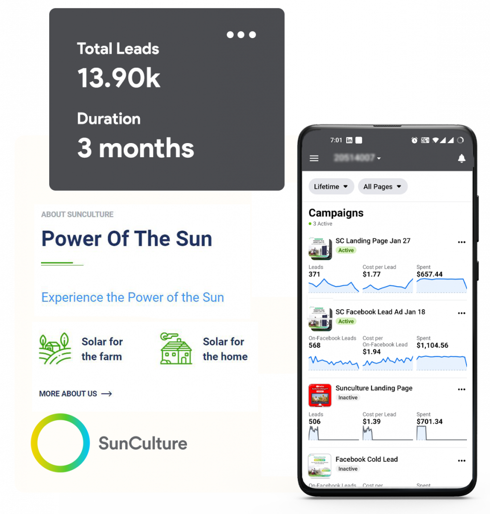 The critical demands of SunCulture—an Agritech startup funded by Microsoft—were to reach a relevant audience, develop brand awareness, build their social presence, and generate quality leads.